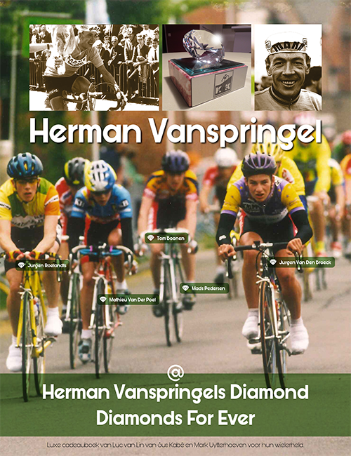 Het Boek is een luxe uitvoering van 208 pagina’s (25 x 33 cm) met beperkte oplage. Het boek wordt uitsluitend verkocht door Wielercomité Vorselaar vzw aan een vast tarief van 40 euro. Met verzending inbegrepen kost het boek 45,80 euro. Momenteel zijn er nog boeken voorradig. Je kunt het boek van Herman Vanspringel bestellen via: WCVvzw@gmail.com of via http://www.Hermanvanspringelsdiamond.be