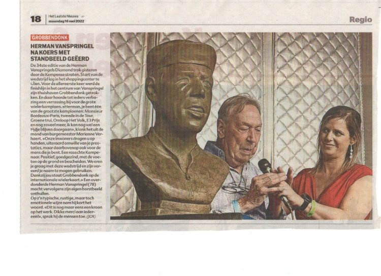 Het kunstwerk krijgt in de heigemeente nu ook een plaats. Ook die andere superfan, Mechelaar Mark Uytterhoeven, kon niet bij de onthulling van het monument ontbreken. Hij vindt het jammer dat Vanspringel het kunstwerk niet meer zelf kan zien en er ook zondag niet meer bij is, tijdens zijn nieuwelingenkoers met start en aankomst in Vorselaar.